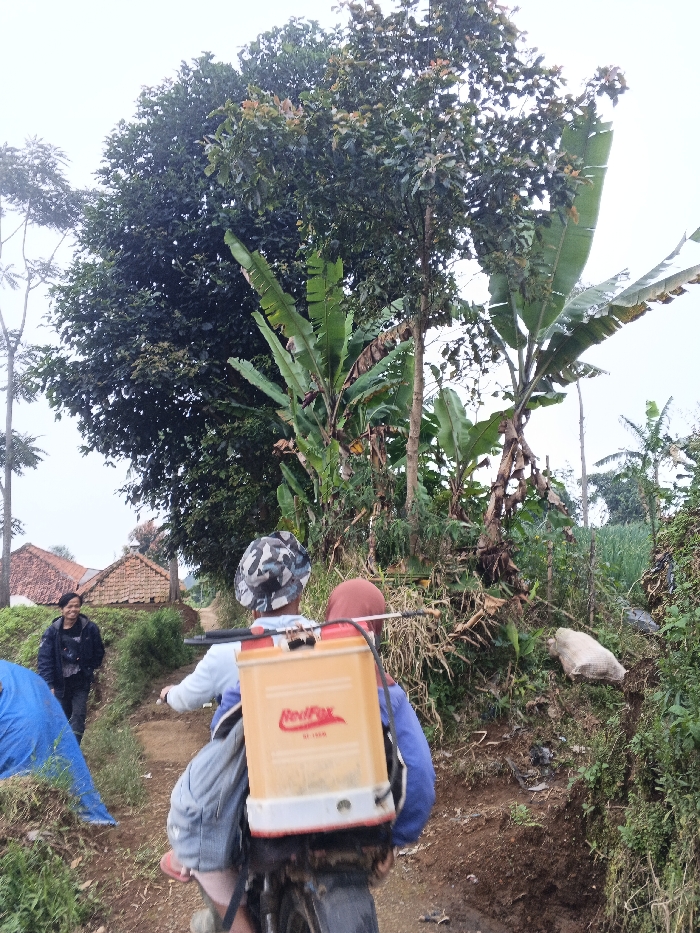 The scene depicts a rural unpaved dirt path in Pinnwe, Myanmar (Burma), under an overcast sky. In the foreground, two individuals are positioned on what appears to be a motorcycle, moving away from the viewer. The person in the rear wears a reddish-brown head covering and a blue long-sleeved garment, carrying a large, rectangular, orange backpack sprayer with "RedFox" and "SF-1500" branding visible on its side. A white hose/wand extends from the left side of the sprayer. The person in front is partially obscured, wearing a camouflage-patterned hat. To the left of the path in the mid-ground, a male individual in a dark jacket stands, smiling towards the viewer, near a blue tarp or plastic sheet on the ground. The immediate environment includes dense green vegetation, notably several large trees and multiple banana plants with broad leaves. On the right side of the path, a steep, vegetated embankment leads down, with a white sack-like object resting on it. In the background left, several rural houses with distinct reddish-brown tiled roofs are visible amidst greenery.