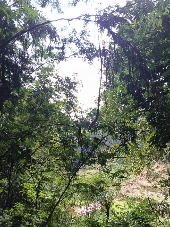 The image presents a downward-angled view from an elevated position in Desa Mburukulu, Indonesia, looking through a dense canopy of lush green foliage