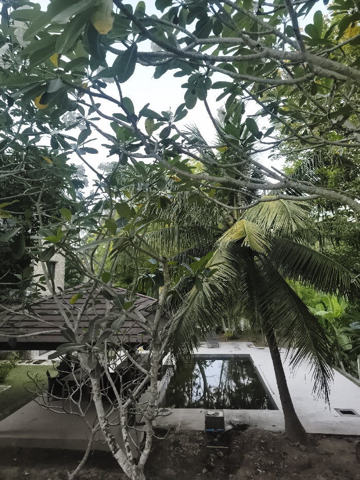 The image displays a tropical outdoor environment within Ko Samui, Thailand. The foreground is dominated by a dense canopy of green foliage and tree branches, some with small white flowers, creating a partial obscuration. A light-barked, mostly leafless tree stands prominently on the left. Below it, a building with a dark-tiled, multi-pitched roof is partially visible. The midground features a rectangular swimming pool filled with dark, reflective water, surrounded by light-colored concrete paving. A single palm tree with dark green fronds leans over the pool from the right side. A small, square utility box with blue conduit is present on the ground adjacent to the pool's edge. The background consists of a dense array of tropical vegetation, including visible banana plants, and a portion of a light-colored, stone-clad building on the far left. The sky overhead appears bright and overcast. No human subjects or discernible activity are depicted.