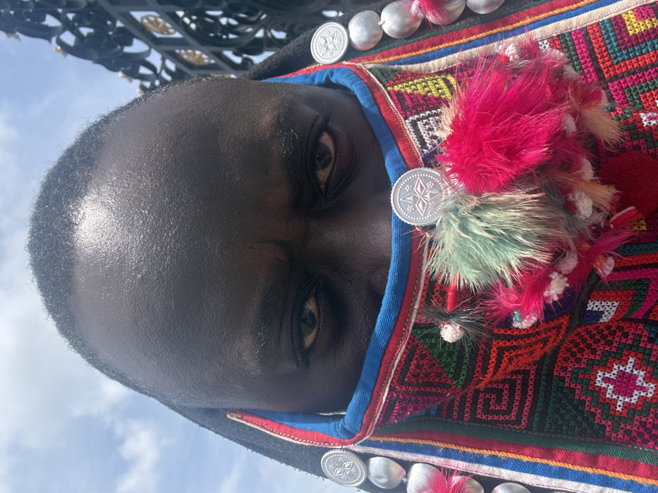 A close-up, head-and-shoulders portrait of an individual, likely male, is depicted in Ado, Nigeria. The subject has dark skin, with only the upper forehead and eyes visible, as the lower face and neck are obscured by elaborate attire. The dark eyes gaze directly forward. The forehead exhibits a reflective sheen. The individual wears a dark garment or head covering that frames the face, bordered by red and blue stripes. This garment is adorned with multiple metallic, silver-colored circular discs featuring an embossed star or floral pattern, and several bell-shaped or rounded ornaments on both sides. A highly embroidered textile covers the lower face and neck, displaying intricate geometric patterns in red, green, pink, yellow, and black threads. A prominent blue band borders this textile along its upper edge. Centrally located on this textile is another silver-colored disc, positioned above numerous fluffy, multi-colored tufts or pom-poms in bright pink, light green, and white/cream. The background reveals a bright, partly cloudy sky and an ornate, dark metallic gate or fence with scrollwork, positioned on the upper right.