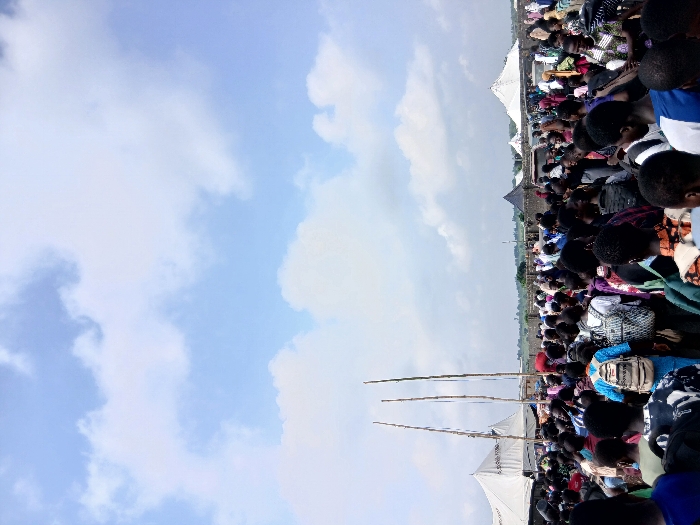 The image presents a wide-angle view of a large outdoor gathering in Epe, Nigeria, under a bright blue sky with scattered cumulus clouds