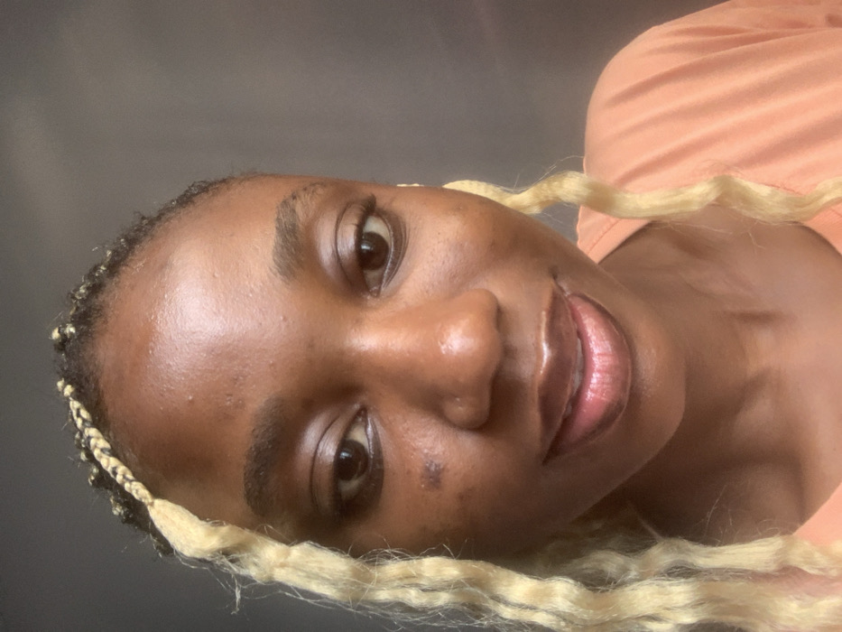 The image displays a close-up portrait of an individual, located in Ogombo, Nigeria. The subject is an adult female with dark brown skin. Her facial features include dark brown eyes, a medium-width nose, and full, glossy lips. A dark, irregularly shaped mark (possible blemish or scar) is present on her left cheek, below the eye. Multiple small epidermal irregularities (e.g., bumps or pores) are visible on her forehead and cheeks. Her hair is styled in braids, with sections of light blonde or yellow wavy braids visible primarily on the left side of the frame, and darker braids at the hairline. Her mouth is slightly open in a subtle smile, with upper teeth partially visible. She is wearing a light orange or peach-colored garment, visible on the lower right side of the image. The background is a uniformly dark gray, unfocused surface. The subject's gaze is directed forward, directly at the camera.