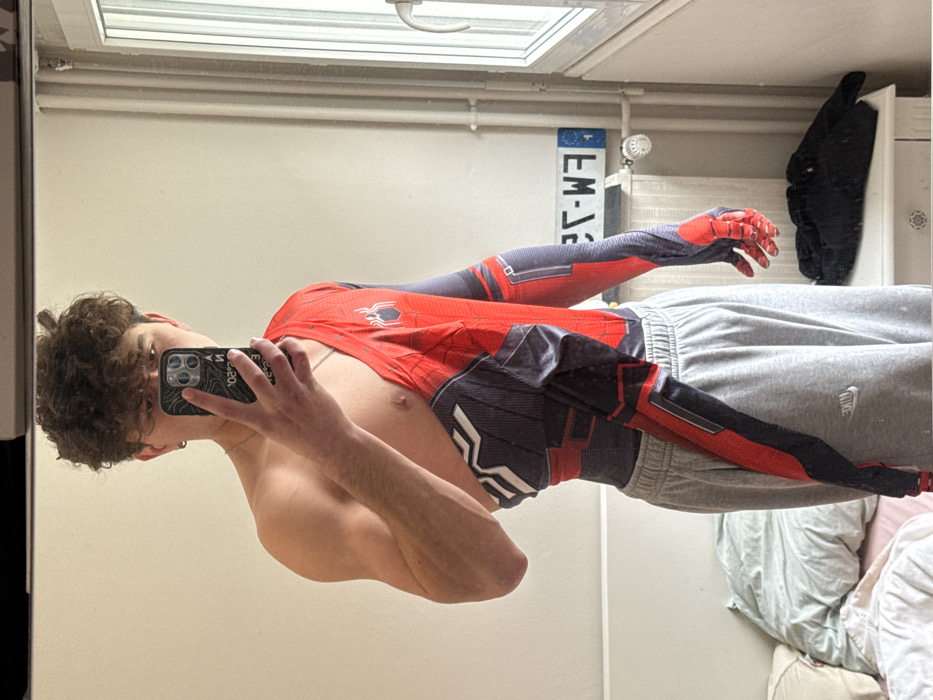 A young male stands in a room in Rennes, France, taking a mirror selfie with a dark smartphone held in his right hand, which partially obscures his face. He has dark, curly hair, a visible earring in his left ear, and a silver chain necklace. His right arm and torso are bare. He is wearing the upper portion of a red, blue, and black long-sleeved costume resembling a Spider-Man suit, featuring a red spider emblem on the chest. This costume covers his left arm and upper torso. He wears grey sweatpants with a white Nike logo on the left thigh. The reflected environment behind him includes a light-colored wall, a white-framed window with a white handle on the right, and a white radiator directly below the window. A blue and white French license plate, partially visible as "EM-13-", is affixed to the wall behind the subject. A white headboard and disheveled bedding are present on the left side, and a white cabinet with a dark object on top is visible on the lower right.