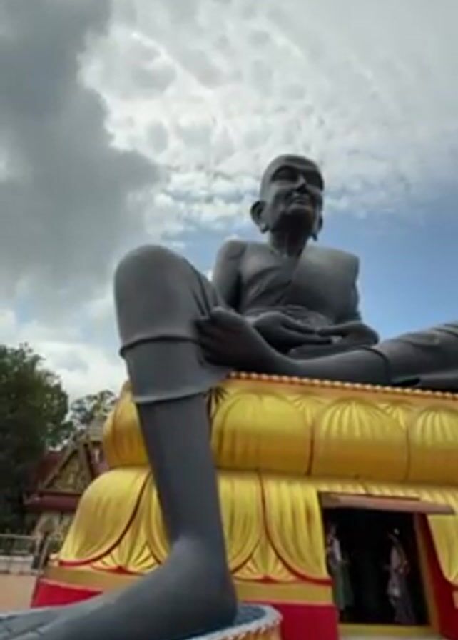 The video features a large, grey statue of a seated monk placed atop a red and gold pedestal, as seen from a low-angle shot