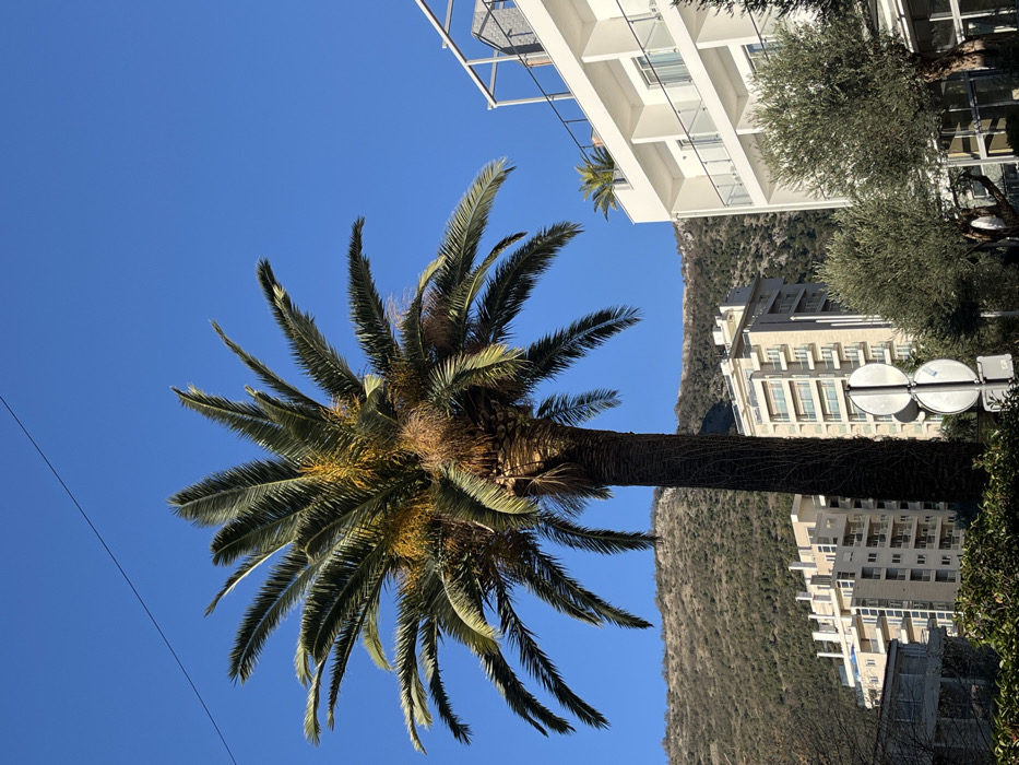 The image displays an outdoor urban environment in Petrovac na Moru, Montenegro, under a clear blue sky. A tall palm tree with a thick, textured trunk and a full crown of green fronds, interspersed with brown, dry fronds and yellowish inflorescences or fruits, stands prominently in the central-left foreground. A thin dark line, likely an overhead cable, traverses the upper left quadrant of the sky. In the background, a large, rocky mountain with sparse, dry vegetation rises. Below the mountain and behind the palm tree, multiple modern, multi-story buildings with light-colored facades and balconies with glass railings are visible. To the immediate right, a distinct white, multi-story building with balconies and glass railings features a small palm tree planted on one of its upper terraces, along with a partial rooftop structure. In the lower mid-ground, to the right of the main palm tree, several smaller trees with dense, olive-green foliage are present, consistent with olive trees. Two circular signs, details unidentifiable, are partially obscured by foliage and the palm tree trunk in the lower center-right. The scene is brightly illuminated by direct sunlight. No individuals are visible.