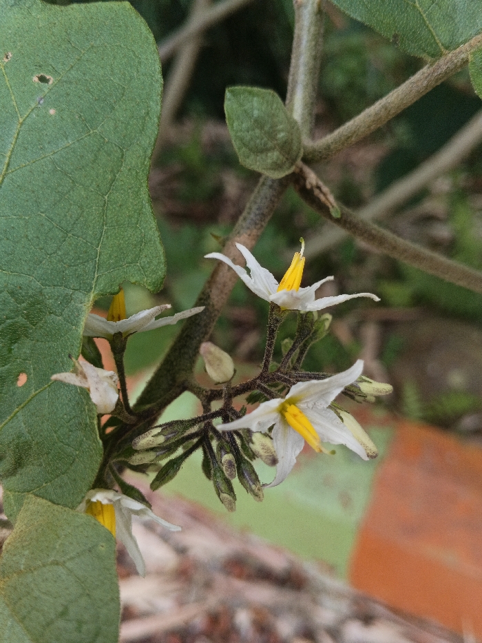 The image presents a close-up view of a flowering plant branch, located in Candelaria, Philippines. The primary subjects are a cluster of white flowers and green leaves. Six white flowers are clearly visible, each possessing five distinct petals and a prominent yellow central structure of anthers. Numerous green-purplish flower buds, exhibiting a slightly fuzzy texture, are clustered along the plant's main stem. The stems themselves are green-brown and appear covered in fine hairs. A large, dark green leaf with visible venation and minor surface imperfections occupies the left side of the frame, partially obscuring some flowers. Other smaller green leaves are present in the composition. The background is out of focus, revealing blurred elements of green vegetation, alongside a distinct geometric pattern of orange/red and light green on the lower right, suggesting an artificial surface. No people, discernible actions, or interactions are present.