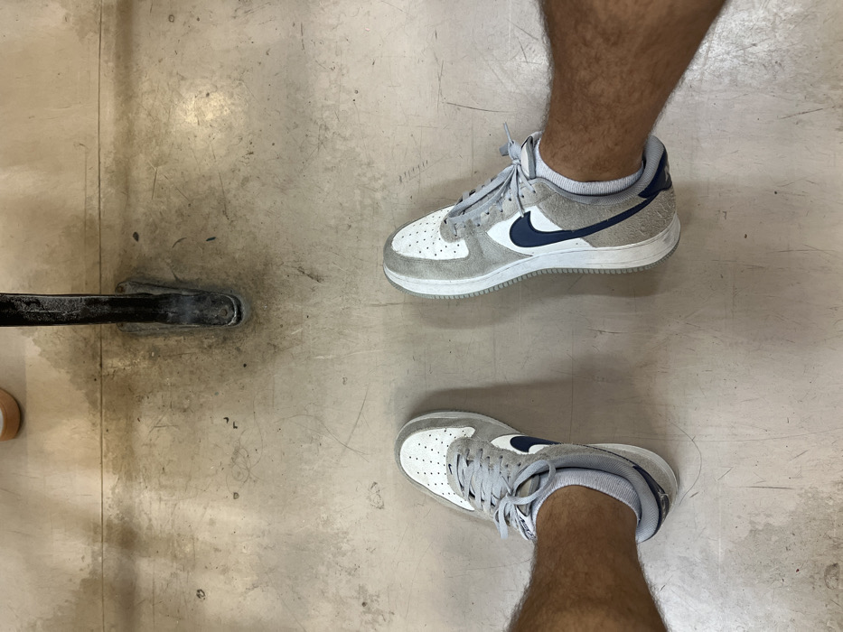 The scene depicts a top-down view of an indoor floor in Givat Shmuel, Israel. The primary subject is an individual's lower legs and feet, positioned on a light-colored, worn, and stained concrete or tiled surface. The legs are hairy and wear white ankle socks with gray and white Nike Air Force 1 style sneakers, featuring navy blue swooshes and light gray laces. The sneakers show signs of wear and dirt accumulation. A black metal post, likely a structural support or furniture leg, is firmly attached to the floor in the upper central area, its base surrounded by dark liquid stains. The tip of a light brown shoe, belonging to a second individual, is partially visible in the upper left corner of the frame.