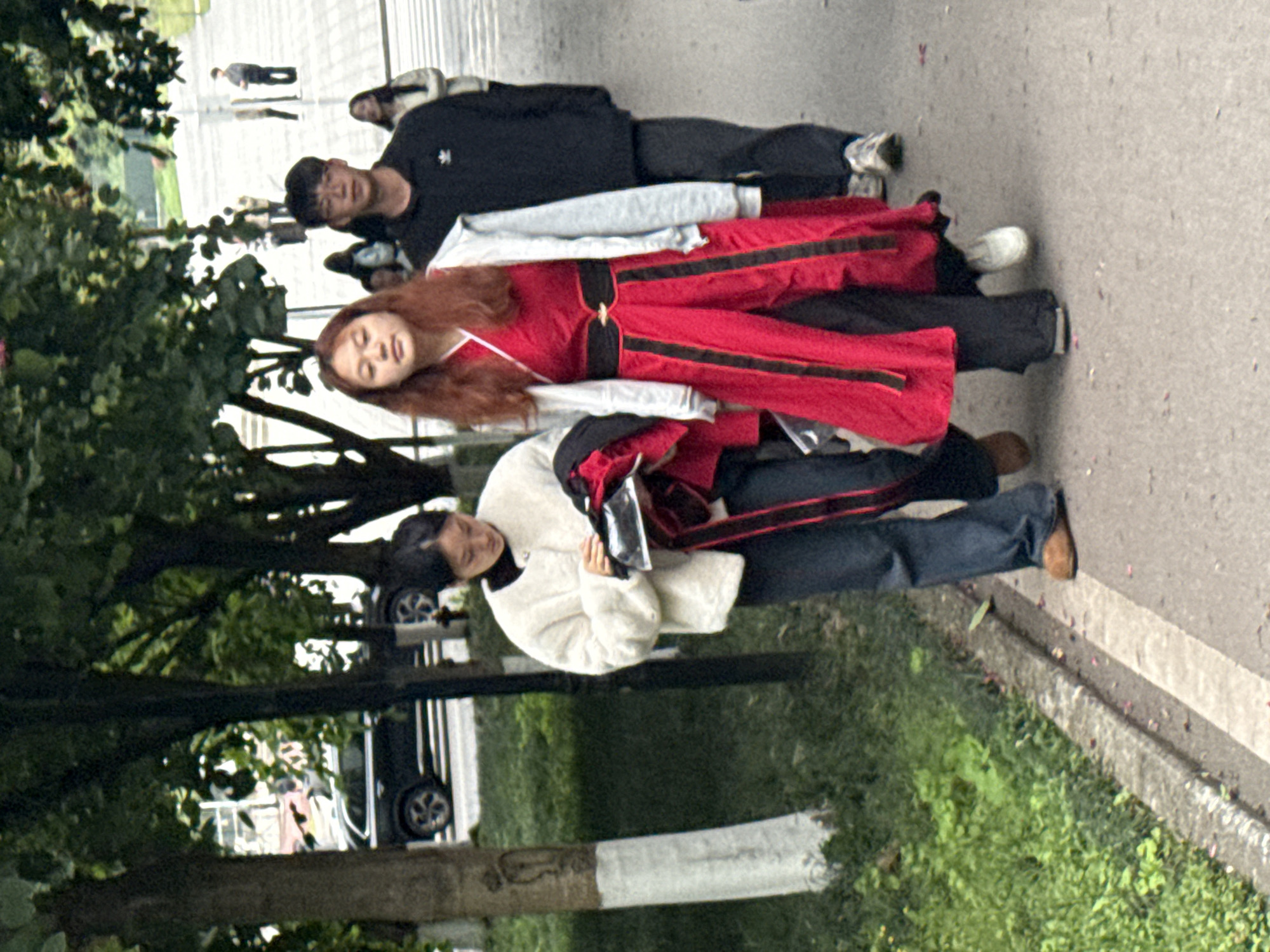 The image, taken outdoors in daylight, shows a group of four people standing close together on a paved surface