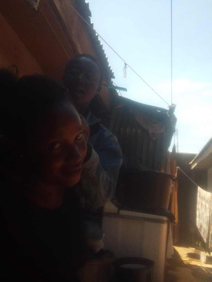 This image, captured in Kabong, Nigeria, depicts an outdoor scene featuring two young individuals. In the foreground, a young person, likely female, with dark skin and dark hair, faces the camera directly, exhibiting a slight smile. Her face is largely in shadow. Behind and slightly above her, a second young person, also likely female, with dark skin, is partially visible, wearing a light blue denim jacket. Her hands are positioned near the first individual's head, suggesting an action of hair styling or braiding. Overhead, a corrugated metal roof is visible, with clotheslines or utility lines strung across the frame; a green comb and a small red item are hanging from one line. In the midground, a white rectangular object, possibly a storage unit, supports a dark basin. A dark bucket is present on the ground in the lower-left corner. The background reveals additional corrugated metal structures and part of another building under a bright, clear sky, indicating strong daylight conditions.