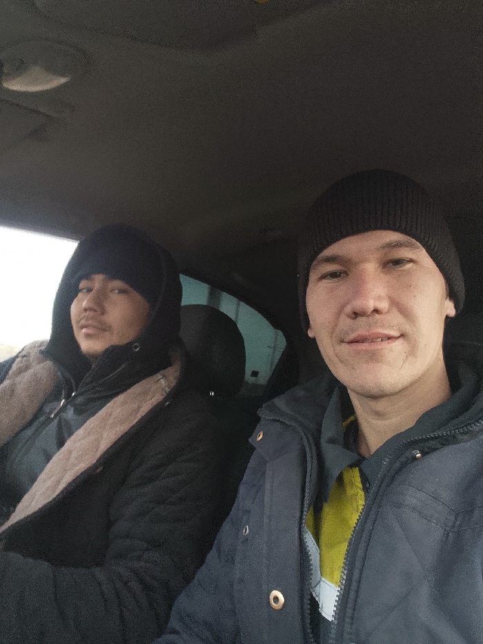 The image depicts the interior of a passenger vehicle, location Unknown, Unknown. Two adult males are visible. The male in the foreground, positioned on the right side of the frame, is seated in the front passenger seat. He wears a black knit beanie and a dark blue quilted jacket over a yellow shirt with a visible reflective strip. His face is directed towards the camera with a slight smile. The second male is seated in the rear passenger seat behind the first individual, positioned on the left side of the frame. He wears a dark hooded jacket with a light-colored, possibly faux fur, trim around the hood, and a black knit beanie underneath. He has a visible mustache and short facial hair. His gaze is directed towards the camera with a neutral expression. The vehicle's dark headliner is visible at the top of the frame. Ambient light enters through the vehicle windows, suggesting daytime.
