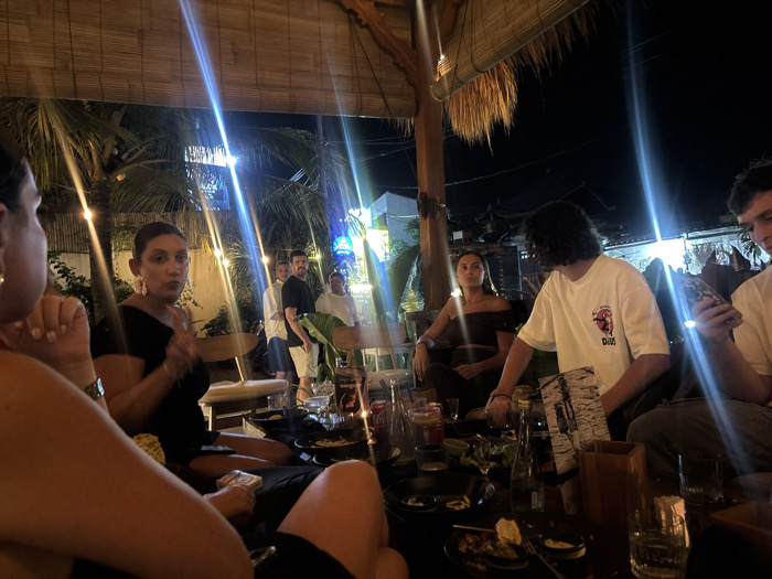 The image captures an outdoor nighttime gathering at a restaurant or bar in Uluwatu, Indonesia