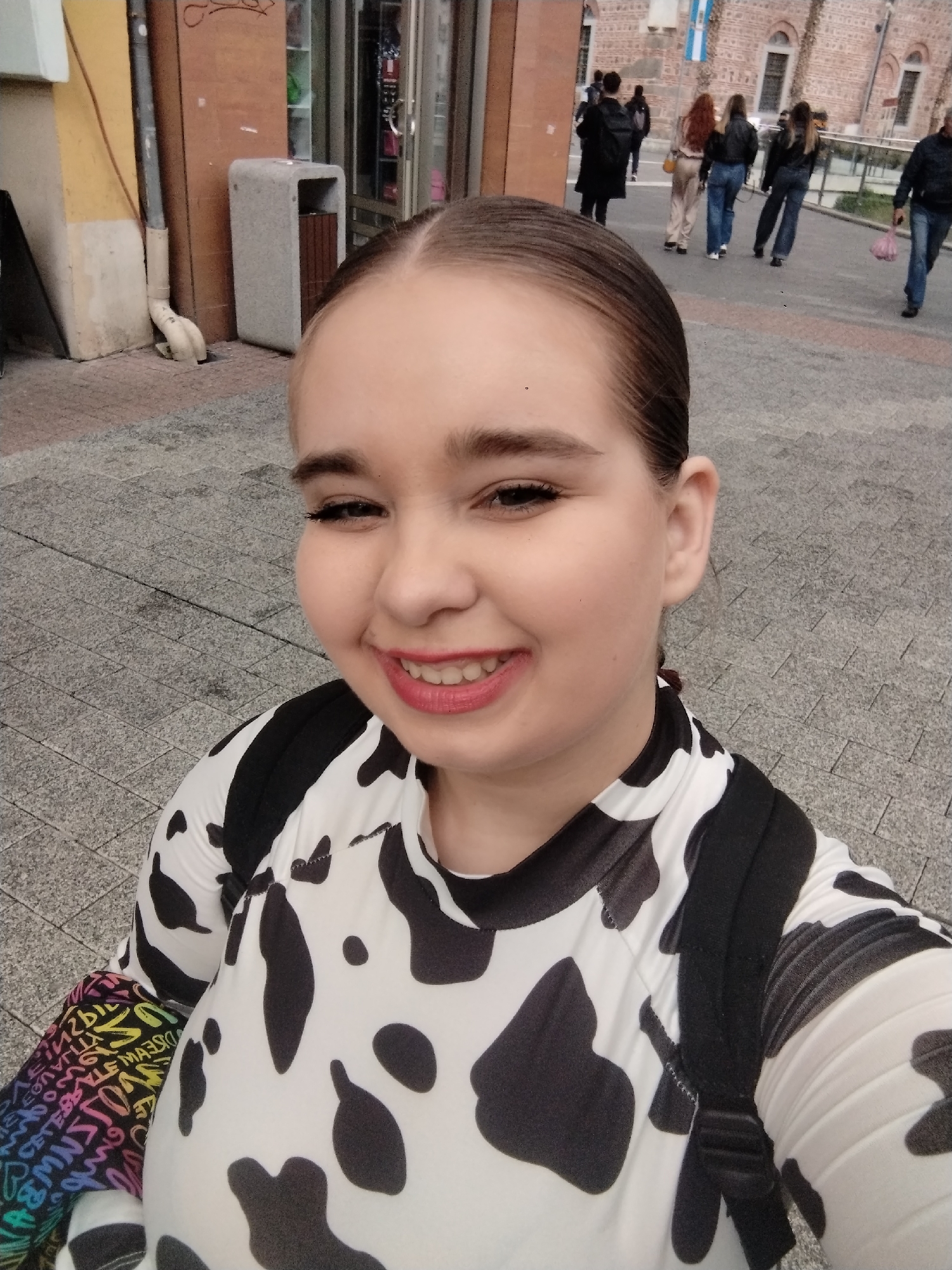 The image is a selfie of a young woman smiling at the camera. She has light skin, brown hair slicked back, and is wearing a black and white cow-print top with a black backpack. She is wearing red lipstick and has noticeable false eyelashes. In the background, a street scene is visible. There are several people walking in the distance, including a group of four women in the center. To the left, there is a building with yellow and brown sections, a gray trash receptacle, and the facade of a shop. The ground is paved with gray stones. Based on architectural features and location context, the image appears to be taken in the city of Plovdiv, Bulgaria.