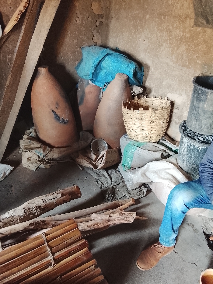 The image depicts an interior scene, likely a storage area or workshop, in Mangu Town, Nigeria. The environment features a rough, light brown wall with visible wear and uneven texture. In the upper left, a weathered wooden beam or plank leans against the wall. The central focus includes three large, conical, unglazed earthenware pots of varying sizes, predominantly reddish-brown, resting on crumpled fabric or sacks. One pot on the far left shows a dark, possibly burnt or stained area. Behind these pots, a blue tarp or fabric covers an indistinct object. To the right of the earthenware pots, a woven light-colored basket, possibly bamboo or wicker, sits atop a stack of sacks. The basket features horizontal and vertical strip weaving, with visible markings including "H.G.N." and "N.A.D.S." Below and around the pots and basket are several sacks; one burlap sack partially visible in the center has "GUADUA" printed on it, while others are white and green. A small metal sieve or strainer rests on one of these sacks. In the upper right, two dark-colored plastic buckets are stacked, the lower one appearing to contain dark, granular material, possibly charcoal. On the concrete floor in the foreground, several pieces of irregularly shaped wood, resembling logs or branches, are scattered. Below them, in the lower left, a mat-like structure composed of numerous parallel wooden sticks or strips is partially visible. A person is partially visible in the lower right quadrant, from the mid-thigh down. The individual wears blue denim jeans and light brown, lace-up suede shoes. The person's posture suggests sitting or squatting.