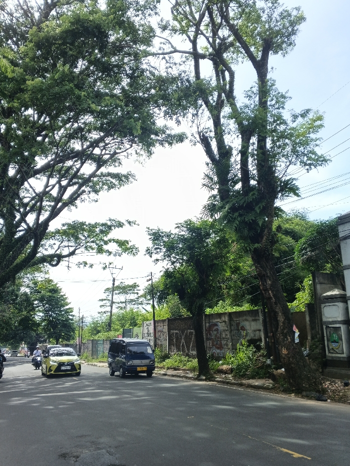 A street scene features a yellow car and a dark blue van driving on an asphalt road. Lush green trees canopy overhead, partially obscuring the sky. A concrete wall lines the right side of the road, adorned with graffiti and overgrown with greenery. Electrical wires stretch across the sky. A tall tree with fern-like foliage grows close to the wall. Another car is seen driving in the opposite direction.