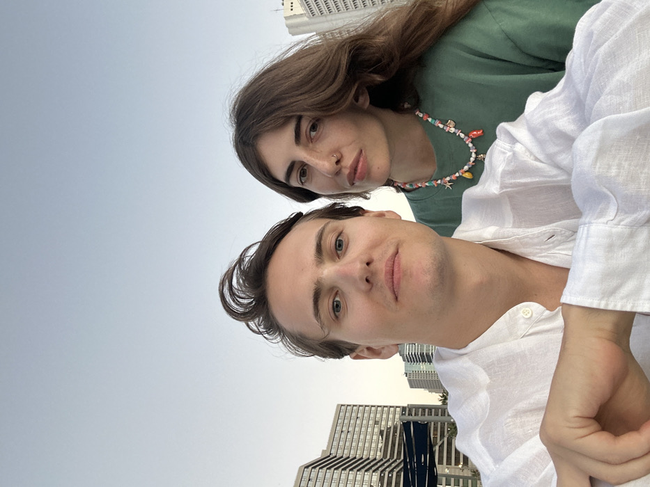A close-up portrait features two individuals positioned against a cityscape under a clear sky. In the foreground, a light-skinned male with short brown hair, styled upwards, and blue eyes wears a white linen-style collared shirt. He looks directly into the camera with a neutral expression. Behind him and to the right, a light-skinned female with long, wavy dark brown hair and brown eyes is present. She has a small silver nose ring on her left nostril and wears a dark green crew-neck top. A multicolored beaded necklace, adorned with various charms including a starfish and conch shells, is visible around her neck. Her gaze is directed slightly past the camera. The background consists of a clear, pale blue sky occupying the upper frame, with multiple modern high-rise buildings displaying reflective windows and light-colored facades. A dark-colored structure, possibly a canopy or part of an outdoor seating area, is partially visible on the left side of the frame, behind the male subject. The urban environment depicted is consistent with Tel Aviv, Israel.