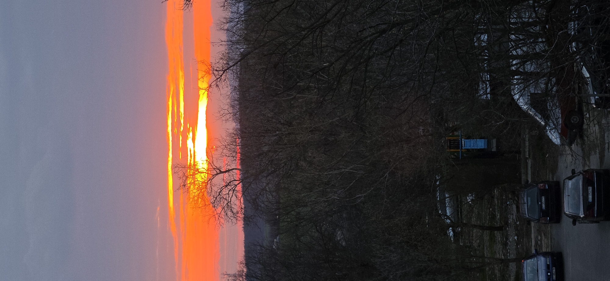 The image captures an outdoor scene in the city of Kazanlak, Bulgaria, at either sunrise or sunset. The upper sky is a muted grey-blue, transitioning to vibrant pinks and oranges closer to the horizon. A prominent horizontal band of bright orange and yellow clouds dominates the mid-sky, partially obscuring the sun, which emits an intense white-yellow glow. Below the horizon, a dark, undulating silhouette of a distant treeline or low hills is visible. A single, bare deciduous tree with intricate branching stands out against the brightest part of the sky, centrally positioned above the treeline. Below this, a dense, dark canopy of leafless trees and bushes fills the mid-ground, obscuring much of the terrain beyond. In the foreground, a paved residential area, likely a street or parking lot, is visible. Four vehicles are present: a dark blue/black sedan (Bulgarian plate 'CA 4843 TK') on the left, a dark grey station wagon (Bulgarian plate 'CT 3857 PX') behind it, a black sedan (Bulgarian plate 'CT 1752 PH') in the lower center, and a white and burgundy/red van partially obscured by trees on the right. A children's playground structure, featuring a yellow-brown frame and a blue slide, is situated among the trees slightly to the left of the center in the mid-ground. The ground surrounding the parked vehicles appears unkempt with patches of dirt and sparse vegetation. No individuals are visible in the scene.