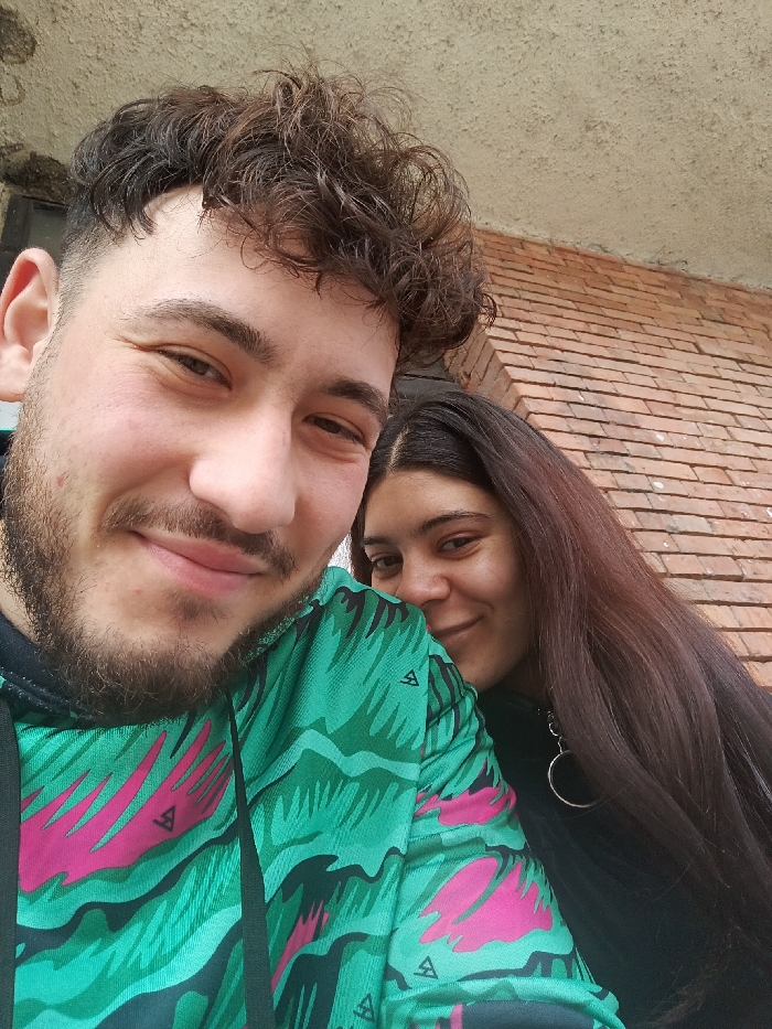 The image displays two individuals in a close-up, likely self-portrait, against an architectural background. A male subject is in the foreground, occupying the left half of the frame, smiling towards the camera. He has light skin, short brown curly hair, a trimmed beard, and wears a long-sleeved hoodie featuring a green, teal, and magenta abstract pattern. Black drawstrings are visible on the hoodie. Behind and to his right, a female subject is partially visible, also smiling towards the camera. She has long, straight dark brown hair and wears a dark top, with a silver-colored ring pendant visible near her shoulder. The background consists of a textured, light-colored ceiling or overhang in the upper left section and a reddish-brown brick wall on the right side. The precise location in the city of Roman, Bulgaria, is not identifiable from the visual information provided.