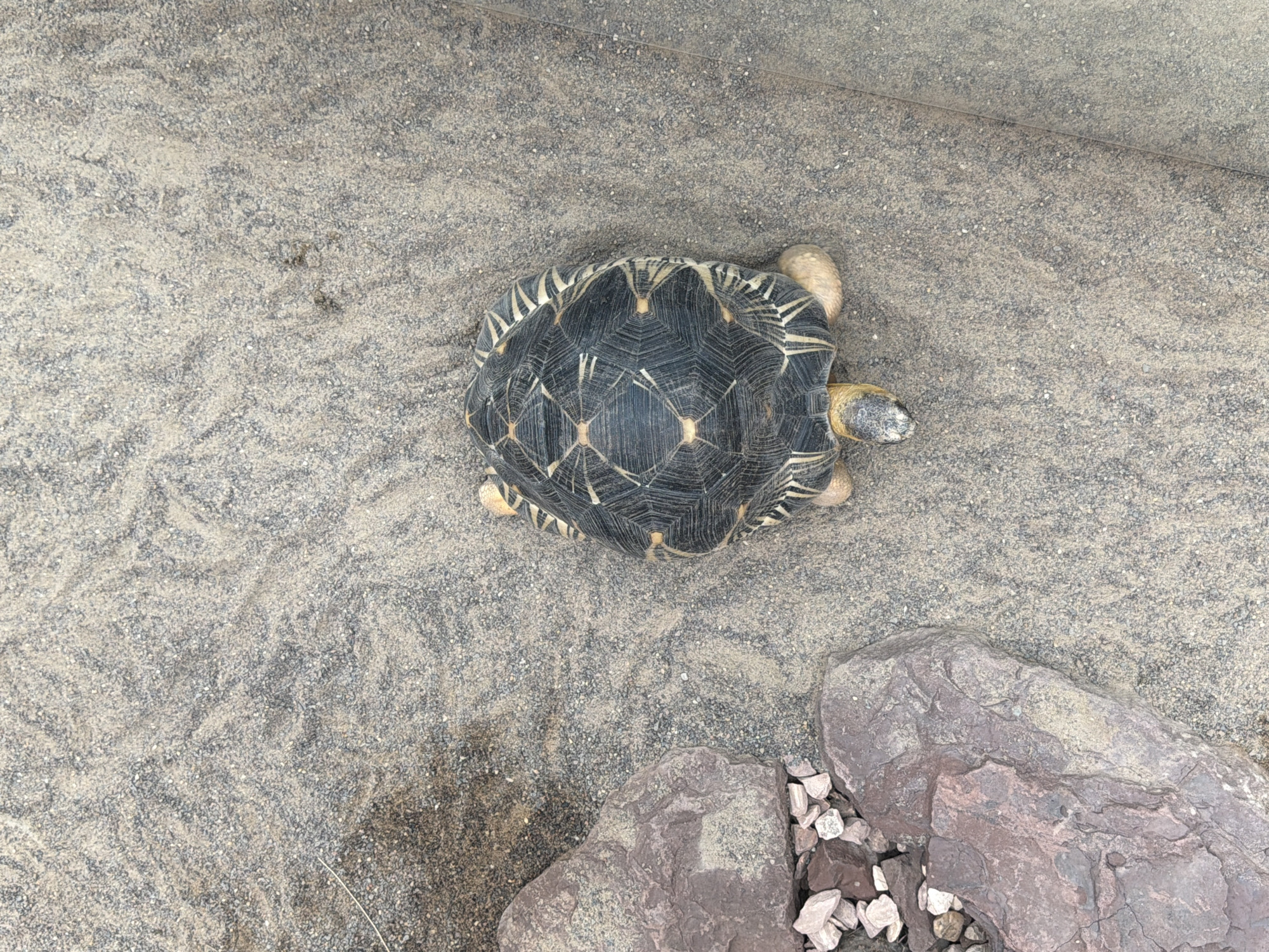 A tortoise is on a gray-brown gravelly surface. To the lower right of the tortoise are two reddish-brown rocks with small white stones and gravel between them. The tortoise has a black shell with light tan/cream-colored markings that appear to radiate from the center of each section of its shell. The tortoise's head and limbs are a light tan/cream color. The location cannot be definitively identified as Leipzig, Germany, without additional information or context.