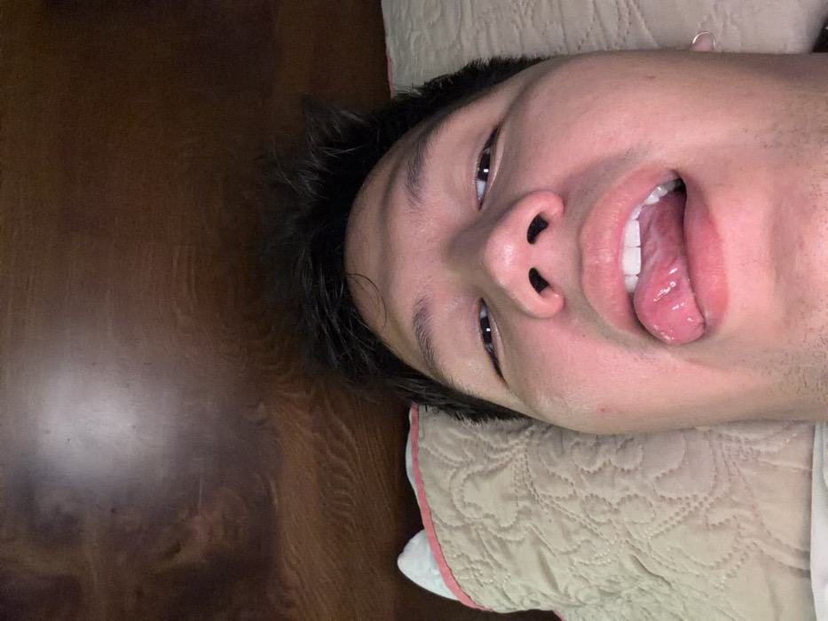 A person lies on a quilted pillow, face angled toward the camera. Their mouth is open, revealing teeth and tongue. One eye is visible, along with a portion of their hair and nose. Wood flooring is visible to the left of the head.