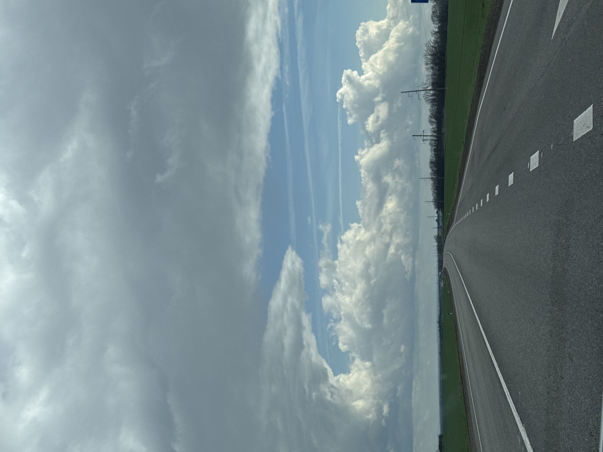road in Radischevo, Russia. The road is made of asphalt and has white lane markings. The sky is cloudy, with some patches of blue. There is green vegetation on either side of the road. Power lines are visible in the distance.