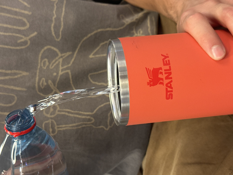 In the city of Spata-Loutsa Municipal Unit, Greece, a close-up image captures the act of pouring water. A stream of clear liquid descends from a transparent blue plastic bottle, topped with a red cap, into an upright, orange insulated tumbler. The tumbler features a silver-colored rim and a red Stanley logo depicting a crowned, winged pig above the word "STANLEY." A person's hand with light skin tone is visible on the lower right, holding the orange tumbler. In the background, a person wears a dark grey t-shirt with a light beige graphic design, which includes an abstract figure resembling a bird or elephant with a long trunk, and partial text "ON QUI". Below the shirt, a segment of light brown fabric, likely trousers or shorts, is visible. The scene is indoors, with no discernible external environmental features beyond the subject and background.