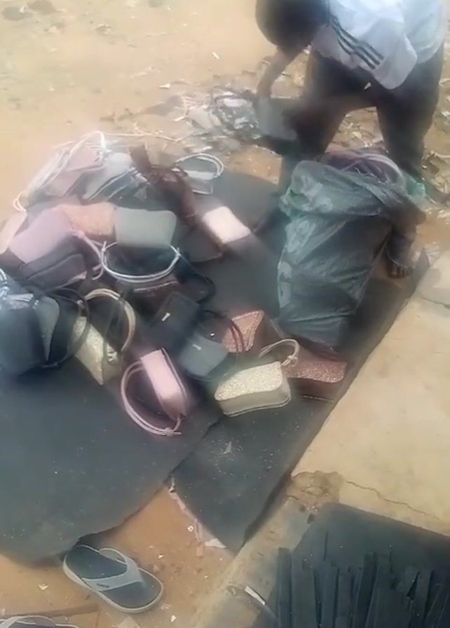 A person wearing a white shirt and shorts is seen bending over a black tarp that is spread out on a paved surface, presumably outdoors. On the tarp, there are approximately fifteen small to medium-sized handbags of various colors, including black, pink, and gold. To the right of the handbags, there is a large black bag that the person appears to be interacting with. Scattered around the tarp are flip-flops and other small items. The background consists of a sandy or dirt area with some litter. To the right of the paved surface there is a line of black material laid out. The overall scene suggests someone is either sorting through or displaying a collection of handbags in an outdoor setting.