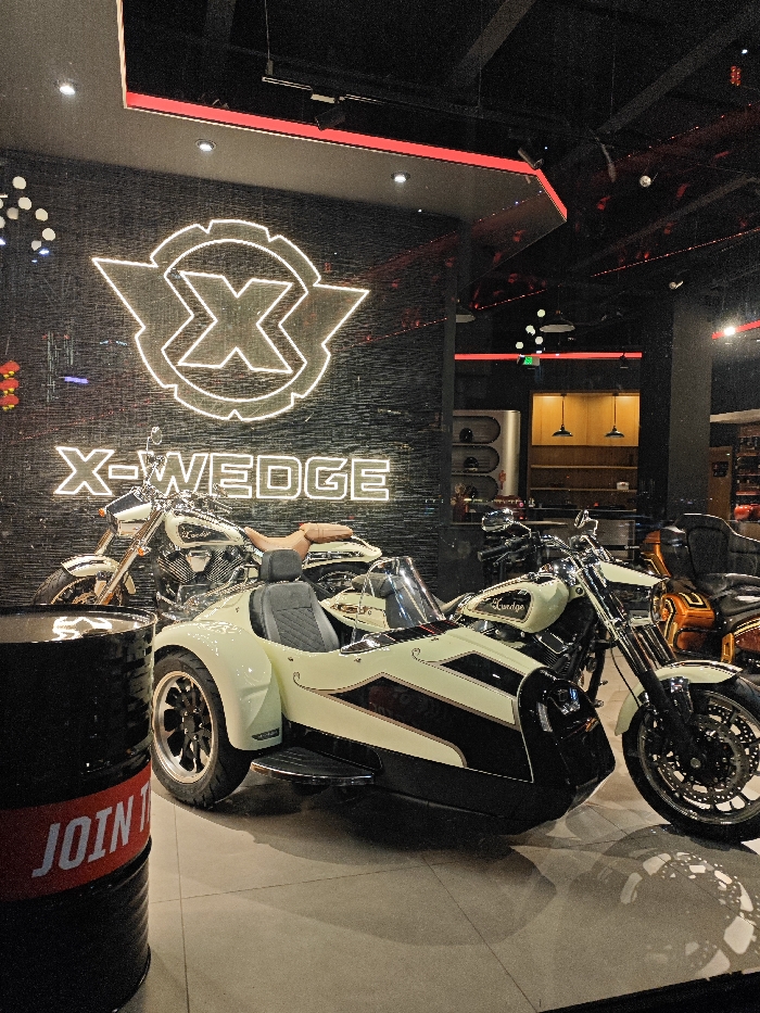 This image depicts the interior of a motorcycle showroom located in Nan'an District, China. The scene is dominated by a cream-colored X-WEDGE motorcycle with a matching sidecar, prominent in the center. This motorcycle features black accents, chrome components, and the sidecar is equipped with a dark gray quilted seat. Behind it, another X-WEDGE motorcycle, also cream-colored, is partially visible. To the far right, a third motorcycle with dark bodywork and orange/gold trim is partially seen. Mounted on a dark, textured wall in the background is a large, illuminated white neon-style sign displaying a stylized 'X' logo above the text "X-WEDGE". In the immediate foreground on the left, a black metal barrel with a red band containing partially visible white text, "JOIN T...", stands as a decorative item. The showroom features a dark ceiling with integrated red LED strip lighting and recessed spotlights. The floor is composed of light-colored square tiles. In the background on the right, a display area with wooden shelving and two hanging industrial-style pendant lamps with yellow interior finishes is visible. No individuals are present in the scene.