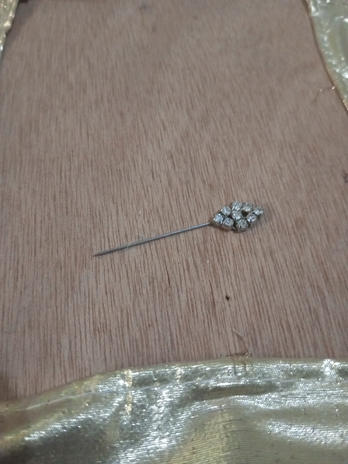 A silver-toned decorative pin rests on a light brown wooden surface. The pin features a slender shaft pointed on its left end and an elongated, marquise-shaped head on its right. The head is adorned with multiple small, clear, faceted stones, approximately 9 to 11 in number, set closely together. The wooden surface displays vertical grain patterns. In the lower portion of the image, a segment of shimmering golden fabric, exhibiting folds and a reflective texture, is visible, positioned adjacent to the wooden surface. The scene is located in Chandragiri, Nepal.