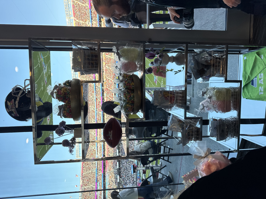 A shelf displays football memorabilia, including a helmet, football, candy baskets, and wrapped gifts. A football field filled with fans is visible through the window behind the shelf. The scene is at an elevated location, possibly a suite overlooking the field. A man with a camera appears to be taking pictures of the event.