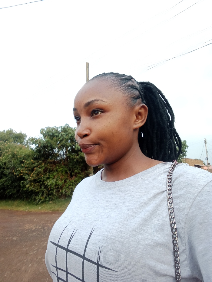 A woman with dark hair braided on top and styled in a ponytail of dreadlocks looks towards the right. She is wearing a light grey t-shirt with a dark grey tic-tac-toe design. A silver chain strap of a bag rests on her shoulder. Green foliage is visible in the background. A utility pole is located behind her. The sky is overcast.