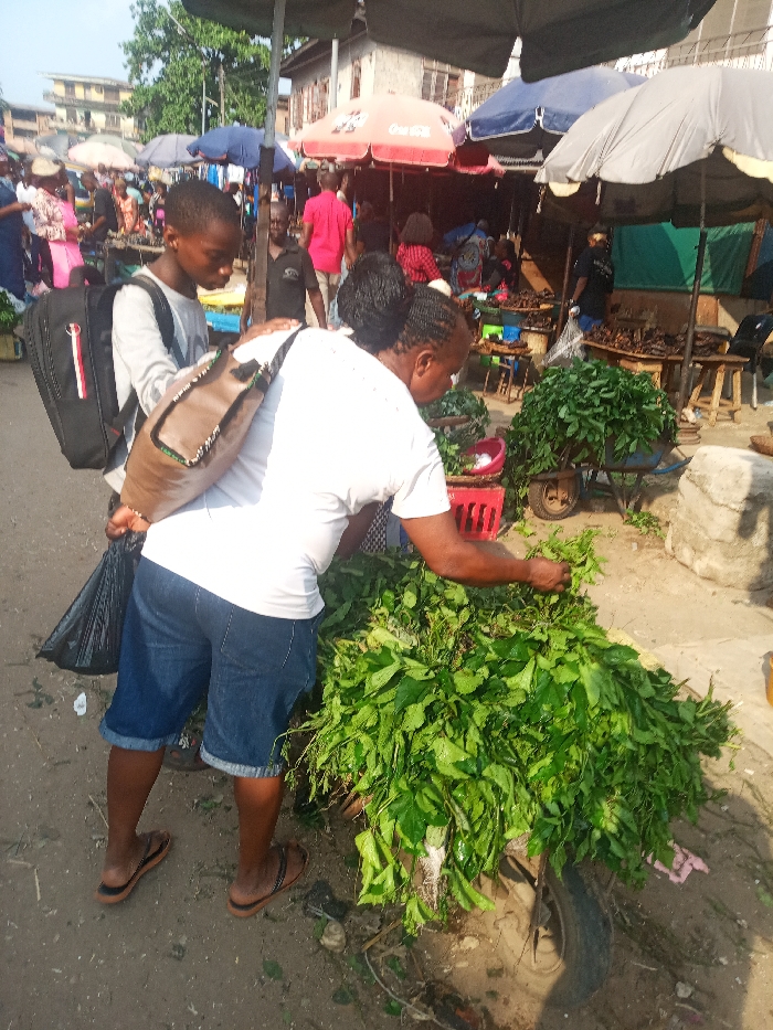 A woman in a white shirt and denim shorts examines leafy greens on a wheeled cart. A younger person with a backpack stands nearby. The scene unfolds in a bustling outdoor market. Various vendors, umbrellas, and merchandise fill the background. Other shoppers are visible in the distance, adding to the crowded atmosphere. Buildings peek through the market stalls. The light suggests a sunny day.