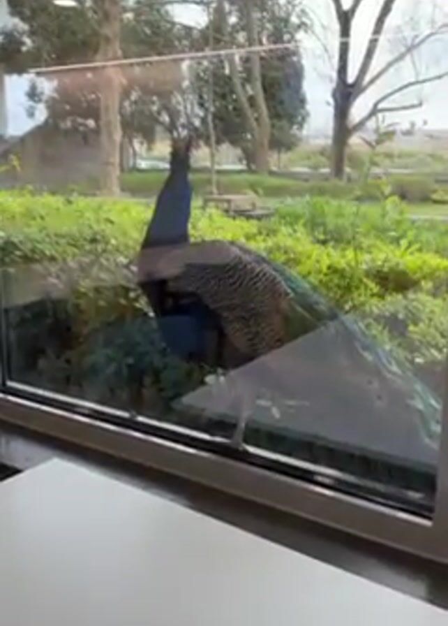 From inside a building, a peacock is viewed through a window