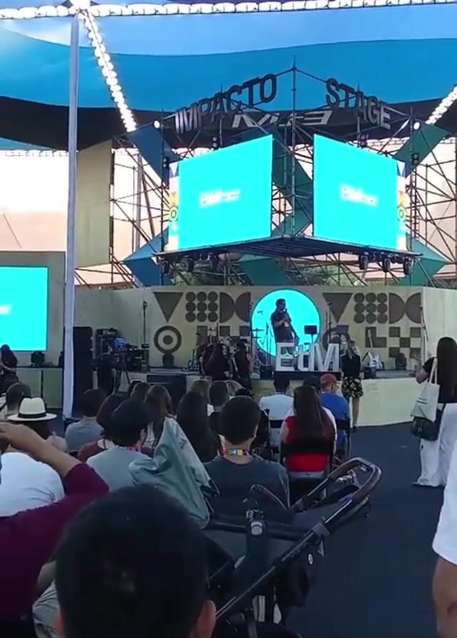 crowd of people sitting in an outdoor venue facing a stage, where a speaker is standing at a microphone and a band is behind him. The stage has two large screens flanking the speaker, and the words "IMPACTO STAGE" are written on the set above the screens. The audience members are seated in chairs and there is a stroller in the foreground. The area is covered by a blue and black awning with string lights.