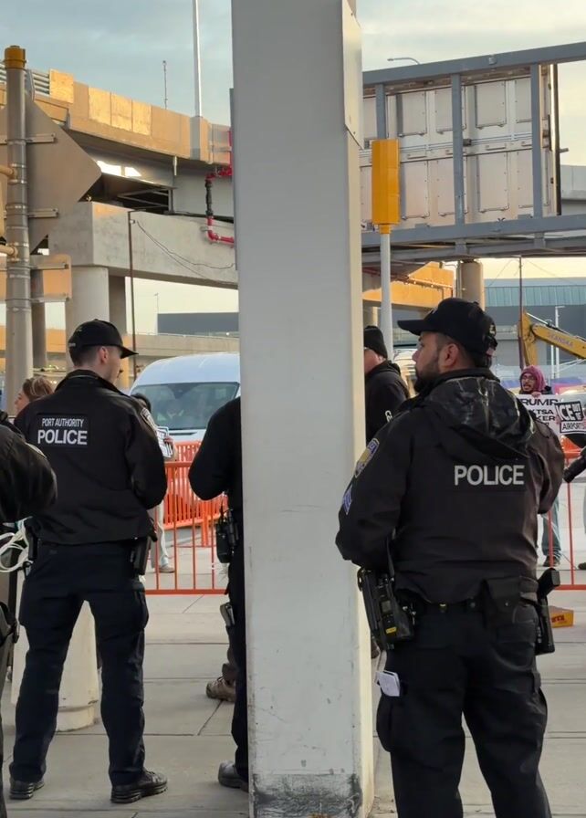 Several Port Authority Police officers are standing in front of a crowd of protestors on a sidewalk. The protestors hold signs that read “Trump Pay TSA Worker Now” and “ICE Out.” Some of the protestors have cameras. A yellow excavator is visible in the background. The sky is clear.