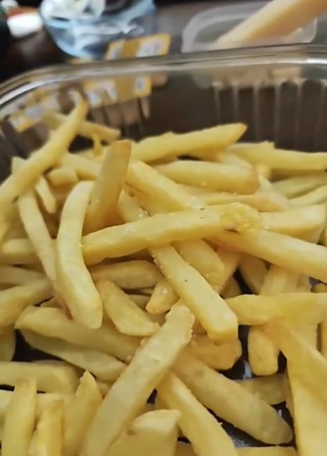 clear, square glass container filled with salted french fries. The fries appear slightly yellow and are packed closely together. In the background, there is a computer keyboard and several small, yellow containers, presumably holding condiments. Another container with a lid is also visible. A hand briefly appears near the container of french fries. The scene is set on a dark brown surface.