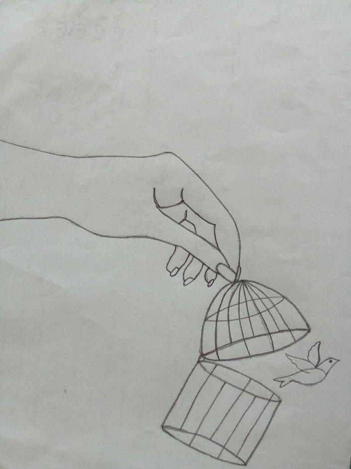 The image is a monochrome pencil drawing rendered on a piece of white paper that exhibits some wrinkles and faint underlying marks from previous use. The drawing depicts a stylized right human hand, entering the frame from the upper left, extending downwards and to the right. This hand is shown grasping the domed, grid-patterned top section of a birdcage, lifting it upwards and slightly away from the cylindrical, open-barred bottom section. A small, unadorned bird is depicted mid-flight, with wings extended, exiting the now-open cage to the immediate right. The overall composition centers the interaction between the hand, cage, and bird towards the bottom-right quadrant of the paper. This image is a conceptual drawing and does not depict a specific real-world location within the city of Quetta, Pakistan, or any other geographical setting.