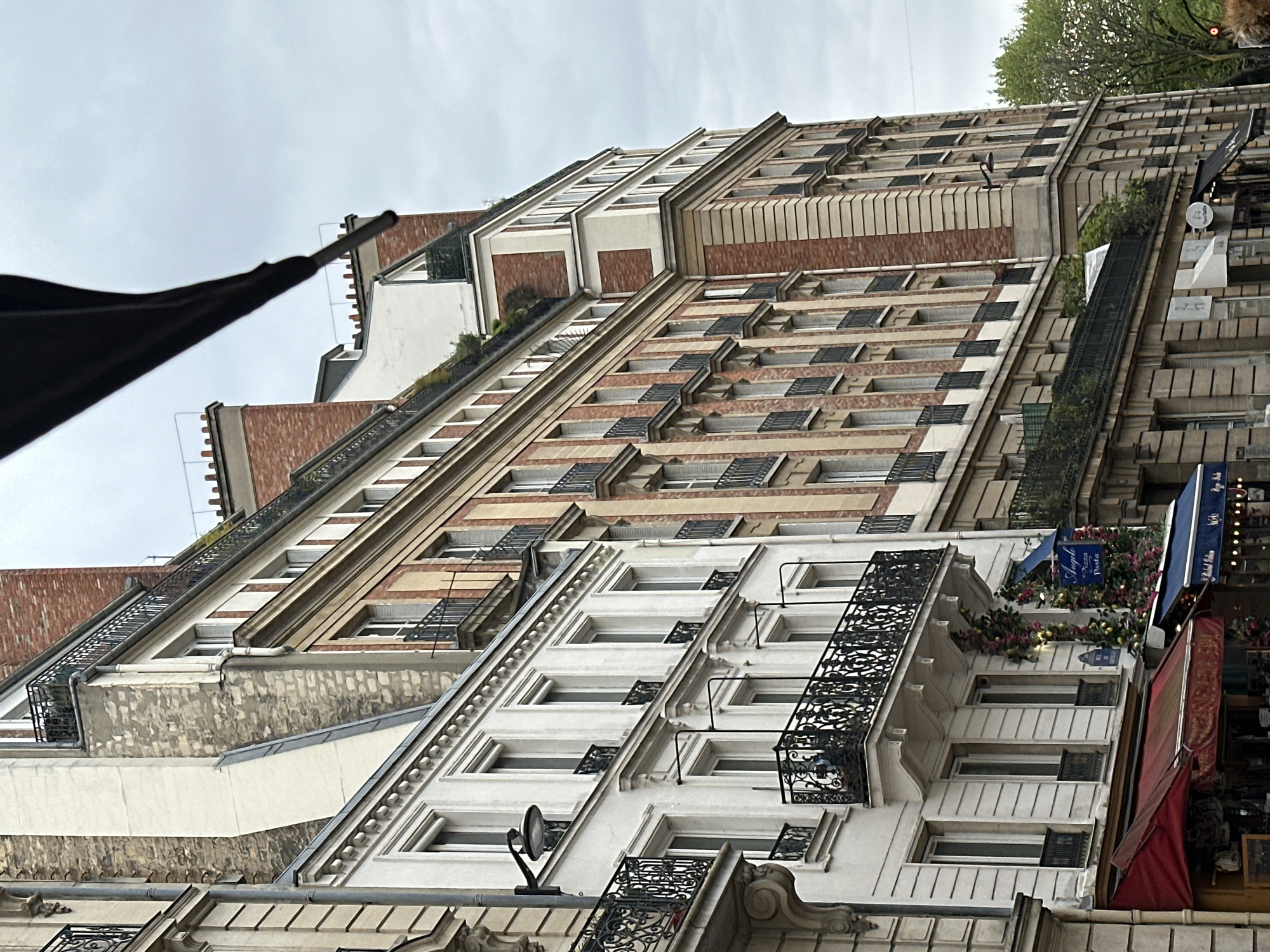 The image presents a street view in Paris, France, specifically on Rue de Richelieu as identified by a street sign visible on the white building. The scene depicts a row of multi-story Haussmannian-style buildings under an overcast sky. In the foreground on the left, a light-colored building features ornate black iron balconies. Adjacent to it, a five-story white building exhibits numerous tall, narrow windows, most with black wrought-iron faux balconies, and a full balcony on the second floor. A black street lamp is mounted on its facade. At street level, a red fabric awning extends over a shop entrance. To its right, a blue fabric awning covers a shop named "Angelo Pizzeria Pasta," which is decorated with artificial pink and green floral garlands. Further right, a taller building constructed with alternating sections of tan stone or stucco and reddish-brown brickwork rises, featuring multiple stories of windows, each equipped with a small black iron balcony or railing. The upper stories are set back, incorporating visible rooftop terraces and attic windows. The rightmost building continues this architectural style, displaying a corner section with classical architectural details and ground-floor shopfronts beneath awnings. A tree with green foliage is partially visible on the far right. No individuals are clearly visible. A dark, elongated object, likely part of an umbrella or vehicle frame, extends diagonally from the upper right corner of the image.
