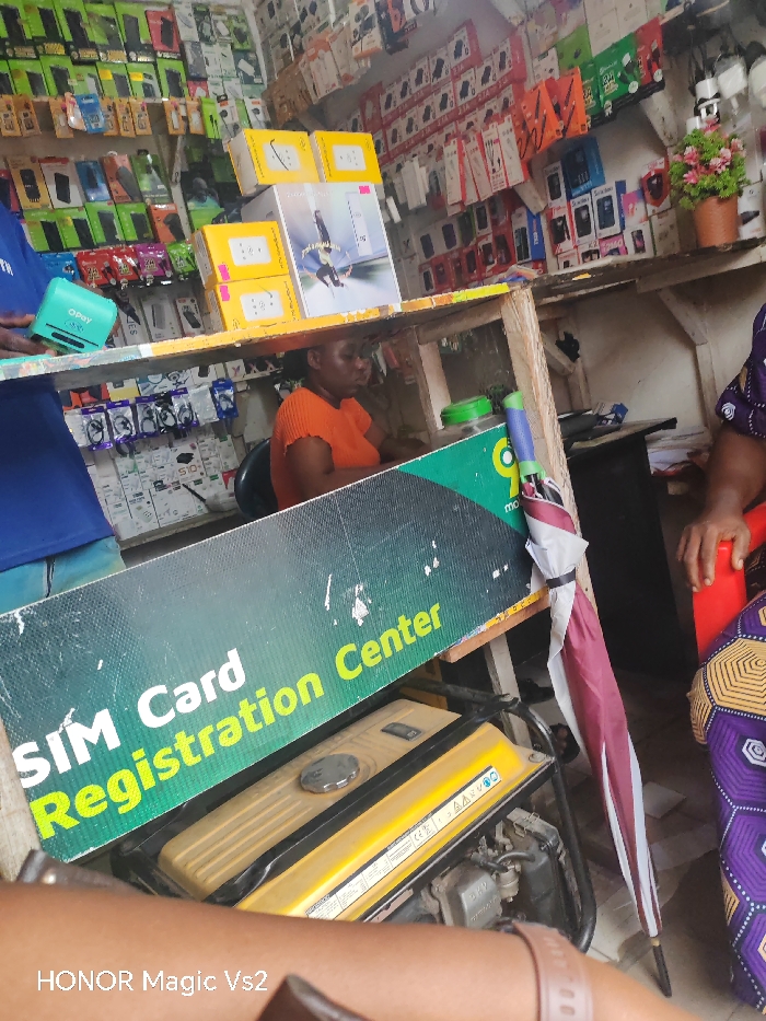 This image depicts the interior of a mobile phone accessories and SIM card registration center in Animashawun, Nigeria