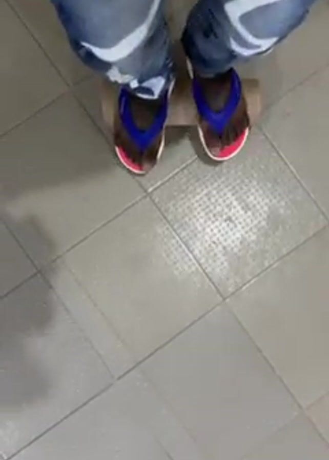 A person stands on a cardboard tube. They are wearing blue jeans with white graphic print and colorful flip-flops. They slightly move their feet, which causes the tube to roll. The tube rests on a tiled floor. A blue edge of a surface can be seen in the bottom-right of the frame.