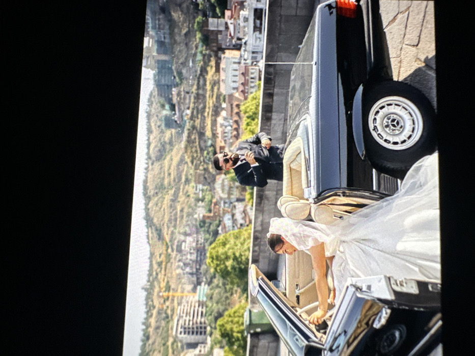 The image captures an outdoor scene featuring two individuals and a classic car positioned on a paved area adjacent to a low concrete parapet. Beyond the parapet, a densely built city sprawls across steep, tree-covered hills under a bright sky. Buildings of various architectural styles are visible, with a prominent yellow construction crane situated on a distant hillside. In the foreground, a black two-door convertible car, identified as a classic Mercedes-Benz with its soft-top roof retracted, is parked. Its interior features light-colored, possibly cream, upholstery. The driver's door is open. A white multi-spoke alloy wheel is visible on the rear passenger side. A silver radio antenna extends from the rear right fender. A woman, appearing to be a bride, is seated in the driver's seat of the car. She wears a white wedding gown with a full skirt that flows out of the open driver's door and over the ground. A white veil is attached to her dark hair. Her left hand rests on the steering wheel, and she looks forward or slightly to the left. Standing on the paved ground behind the car, slightly to the right, is a man. He wears a dark, double-breasted suit, a white shirt, and a dark tie. He has a dark beard and mustache and is wearing dark sunglasses. He holds a light-colored object, possibly a cigarillo or cigarette, in his right hand, raised towards his mouth. A green waste bin is visible near the concrete parapet behind the car on the left side of the frame.