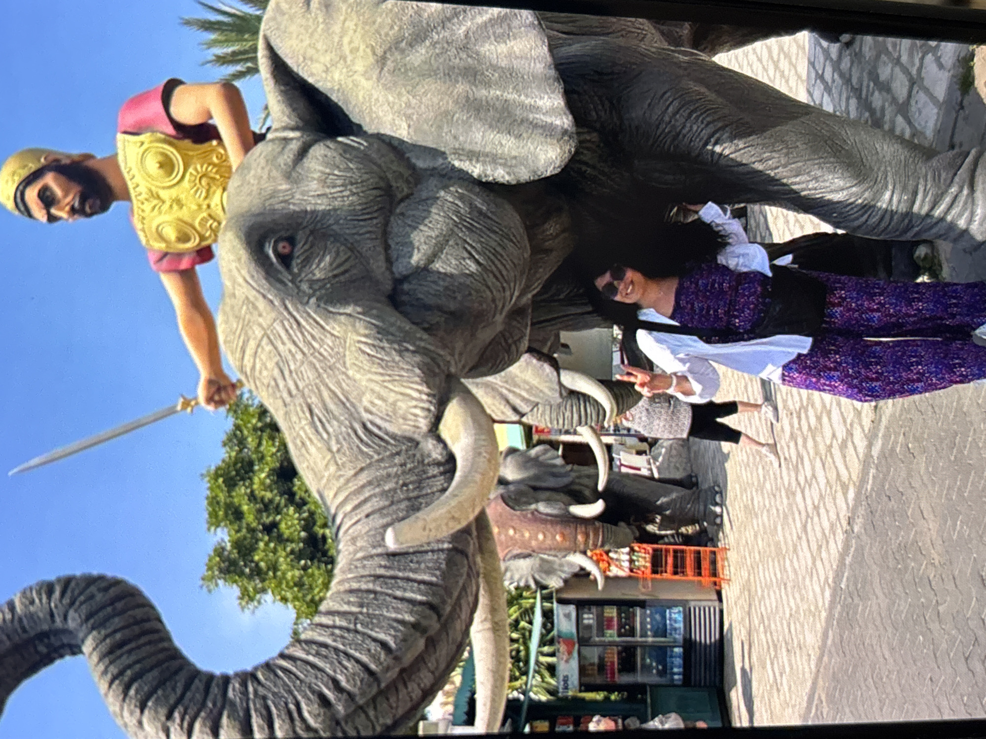 A color photograph shows a life-size, gray elephant statue with a man in Roman warrior garb atop