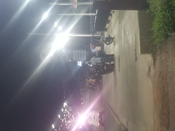 The image depicts a nighttime urban scene in Zango-ndaji, Nigeria, illuminated by multiple artificial light sources creating significant lens flares. The setting appears to be an elevated roadway or bridge, characterized by a dark railing system on the right and prominent light poles extending into the background. In the mid-ground, a group of approximately four individuals is gathered. One person in a light-colored shirt stands centrally, facing away from the camera, near an upright dark motorcycle. Another person in dark attire is partially visible next to them. Further left and slightly behind, a person in a light yellow or tan shirt stands near additional motorcycles. A fourth person in dark clothing is partially visible near the right of the central group. On the far left, a white vehicle, possibly an ambulance or a utility van, with "AMBULANCE" or similar text visible on its side, moves away from the camera, its rear lights emitting a strong pinkish-purple glow. On the right side of the roadway, a dark motorcycle lies on its side near the railing. In the background, beyond the central activity, large illuminated signs are visible, one clearly displaying "HP" and another indicating "OUT." The ground surface is paved, exhibiting minor discoloration and wear. A low concrete barrier with overgrown grass is present in the immediate foreground on the right.