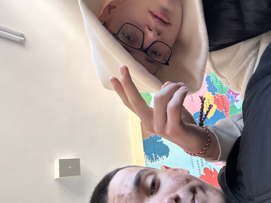 The image depicts two young males in an indoor setting, identified as a classroom or educational facility, likely located in Shumen, Bulgaria, based on the presence of a map with Bulgarian text. The individual on the left is partially visible, presenting a close-up of his upper left face, characterized by short dark hair and multiple acne lesions on the forehead and left cheek. He wears a dark garment. On his right wrist, a red and white braided bracelet, consistent with a Martenitsa, is visible. The individual on the right occupies the majority of the frame, wearing black-rimmed glasses and a light-colored hood or hat that covers most of his head. He is seen with his left hand raised, displaying a "V" or peace sign with his index and middle fingers extended. He wears a light-colored long-sleeve shirt underneath a dark, sleeveless puffer vest. His facial expression is neutral, and he looks directly towards the camera. The background features a large, colorful wall map of Europe with country names and geographical features labeled in Cyrillic script, including "БЪЛГАРИЯ" (Bulgaria), "НОРВЕГИЯ" (Norway), and "АВСТРИЯ" (Austria). The ceiling is white, equipped with two parallel fluorescent tube lights and a single square white mounted object, likely a speaker or ventilation unit, visible in the upper left quadrant. The lighting appears even and bright.
