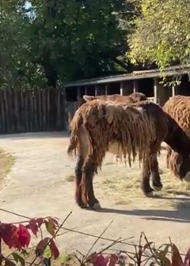 three Poitou donkeys in an enclosure at a zoo or similar venue