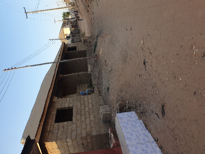 The scene depicts an unpaved dirt road in the city of Unknown, Unknown, under a clear, light blue sky. In the immediate left foreground, a low, rectangular structure is partially visible, tiled with a light blue and white geometric pattern. Adjacent to this, a section of a reddish-brown wall appears. To its right, the sandy, light brown dirt road shows uneven terrain and scattered small debris. In the midground on the left, a single-story building constructed from unplastered concrete blocks with a corrugated metal roof is prominent. This building features multiple open rectangular apertures functioning as window and door frames, and a covered front porch supported by several wooden columns. A lone individual, dressed in a blue shirt and light-colored trousers, is seated on the ground near the base of this building, beneath the porch overhang. To the left of this person, several grey concrete blocks are stacked on the ground. A tall, weathered wooden utility pole, slightly leaning to the right, stands in the midground right of center, supporting multiple dark overhead wires that extend across the frame. The unpaved dirt road continues into the background, where more buildings of varying construction styles are visible, including a lighter-colored structure with a brown roof on the right. Another wooden utility pole with wires is present further down the road on the right. In the distant background, several indistinct human figures are observed moving along the dirt road, with one appearing to be on a bicycle, traveling away from the viewer.