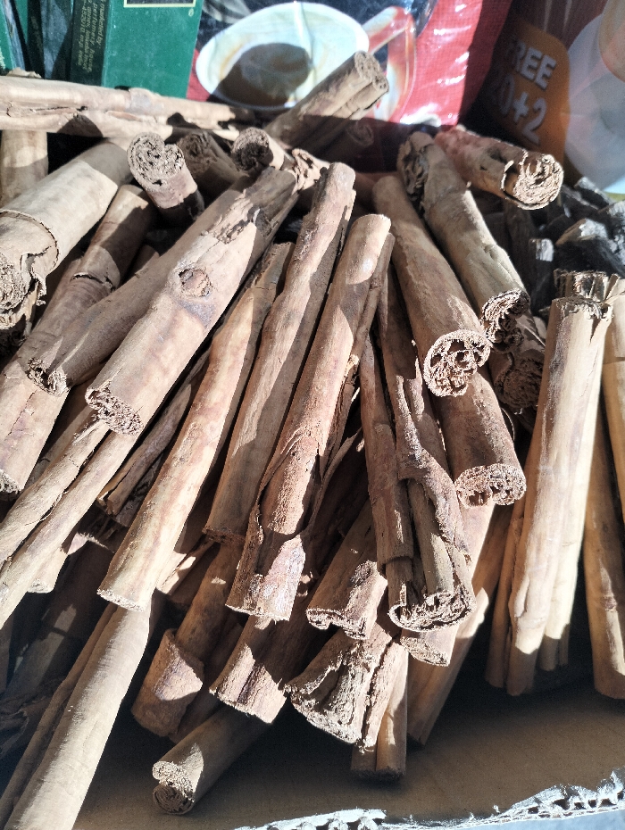 - "This image displays a close-up, eye-level view of a large quantity of dried cinnamon sticks (quills) piled loosely, indicative of a commercial setting such as a spice market or shop in the city of Homs, Syria" by FM-4RDN43, licensed under CC BY 4.0