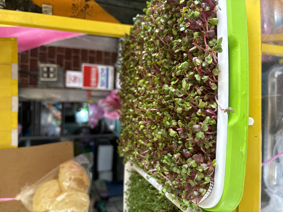 The scene depicts an outdoor market or storefront in Yilan City, Taiwan. In the foreground, a large white plastic tray with a green rim occupies the right side, densely filled with red-stemmed microgreens featuring small green cotyledons, consistent with radish sprouts. To its left, a partial view of a second white tray with green sprouts is visible. These trays rest on a yellow surface, which is elevated above a metallic counter or display. In the upper-left quadrant, a clear plastic bag containing four round, light-colored food items, resembling bread rolls or pastries, hangs suspended by a pink string. A brown panel is partially visible behind the bag. The background is out of focus, revealing a doorway leading into an interior space. Inside, shelves with various items are discernible, and a blurred figure, possibly a person wearing pink clothing, is faintly visible. To the right of the doorway, a section of a brick wall features a white sign with a red circle and diagonal line (indicating "no smoking") above red text, and a smaller blue sign below it. An electrical junction box with a four-panel cover is also affixed to the brick wall. A vertical yellow structural element is present on the far right, with a strip of pink fabric or plastic hanging from above.