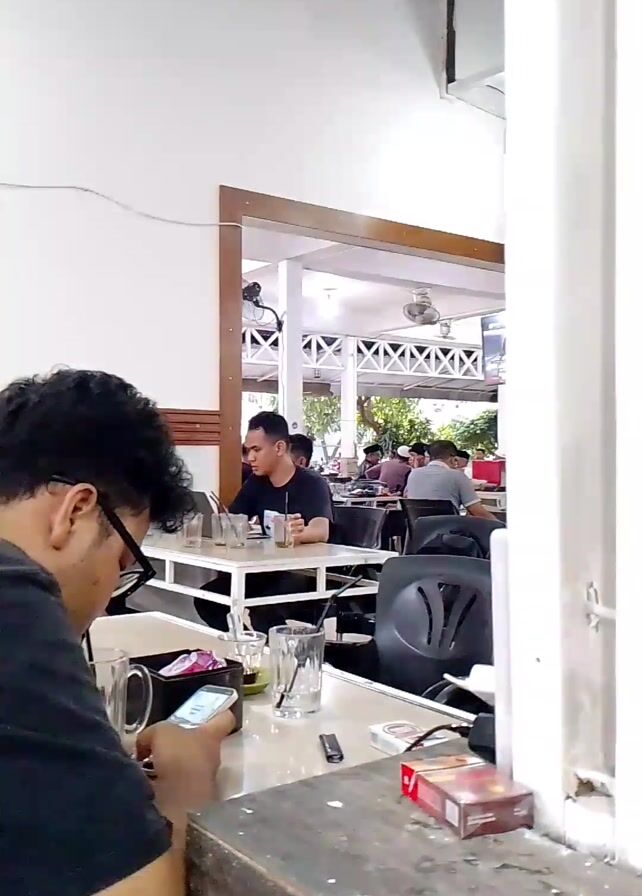 interior of a cafe or restaurant. In the foreground, a person is sitting at a table, looking at their phone. The table also has a mug, glasses, a lighter, and a pack of cigarettes on it. The cafe appears to be somewhat busy, as there are several other people sitting at tables in the background. Some of them are working on laptops, while others are simply talking. The decor includes white walls, brown trim, and a view into a brighter, outdoor area. There is also a brass-colored bell hanging from the ceiling near the top of the frame.