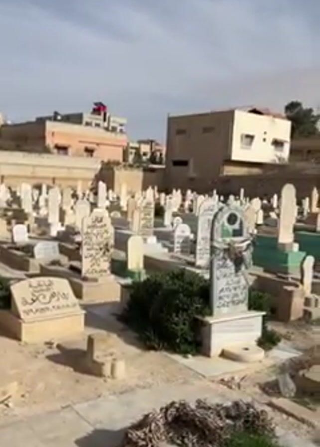large cemetery with numerous headstones of varying styles and colors, mostly white and beige. The grave markers are set in a sandy, dirt-covered ground. Some graves are adorned with dried plants. The cemetery is surrounded by a low wall and adjacent to buildings that appear to be residential or commercial. The sky is overcast, with the sun diffused. No people are visible in the scene.