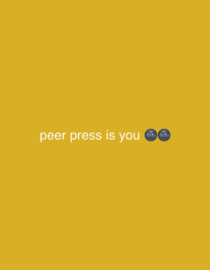 The image is a plain mustard-yellow background with white text centered horizontally. The text reads "peer press is you" followed by two emojis. The emojis depict a dark blue/gray moon with a face. The overall impression is minimalist and likely communicates a message or idea related to peer pressure.